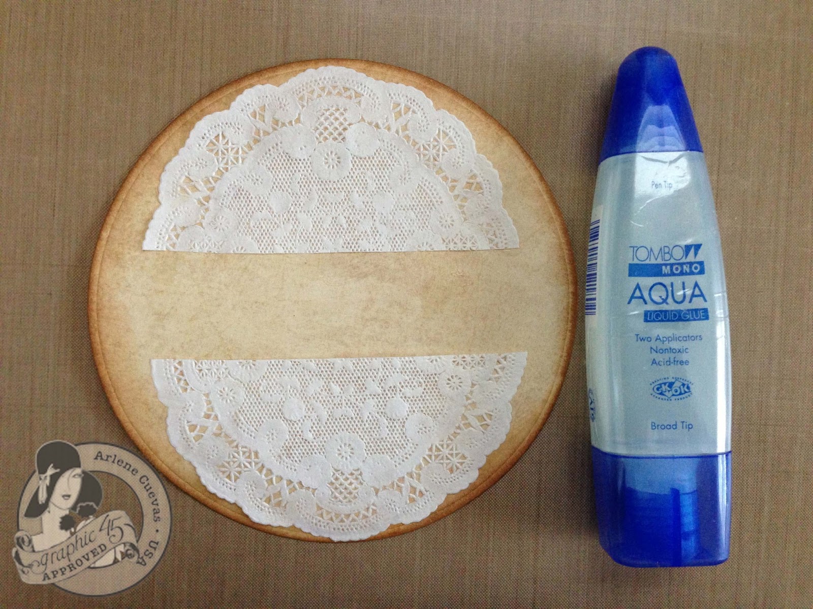 8. Glue the doily pieces to the circle, one on top, one on the bottom. The Place in Time layer will go over the doily pieces, allowing the doilies to “peek” out from the top and bottom of the card.